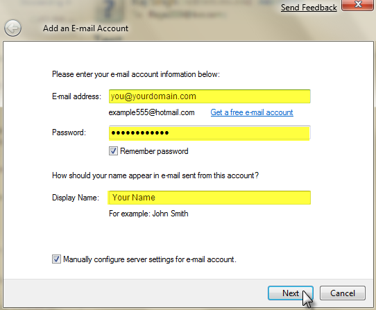 3.     Click on the box underneath stating manually configure server settings for email account.
